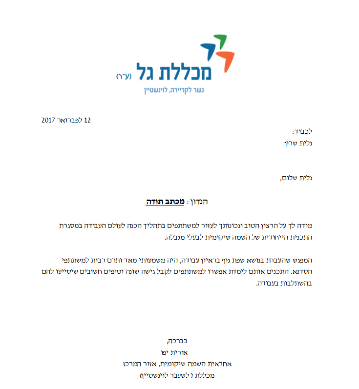 תדמית מקצועית של החברה מול הלקוחות – הסדנה תורמת באופן ישיר לשיפור התוצאות הארגוניות ובנוסף, מטעינה את העובדים באנרגיות של עשייה, בתחושת שייכות לחברה, ובהרגשה של ערך ובטחון עצמי כך שייצגו בכבוד ובמקצועיות את החברה.